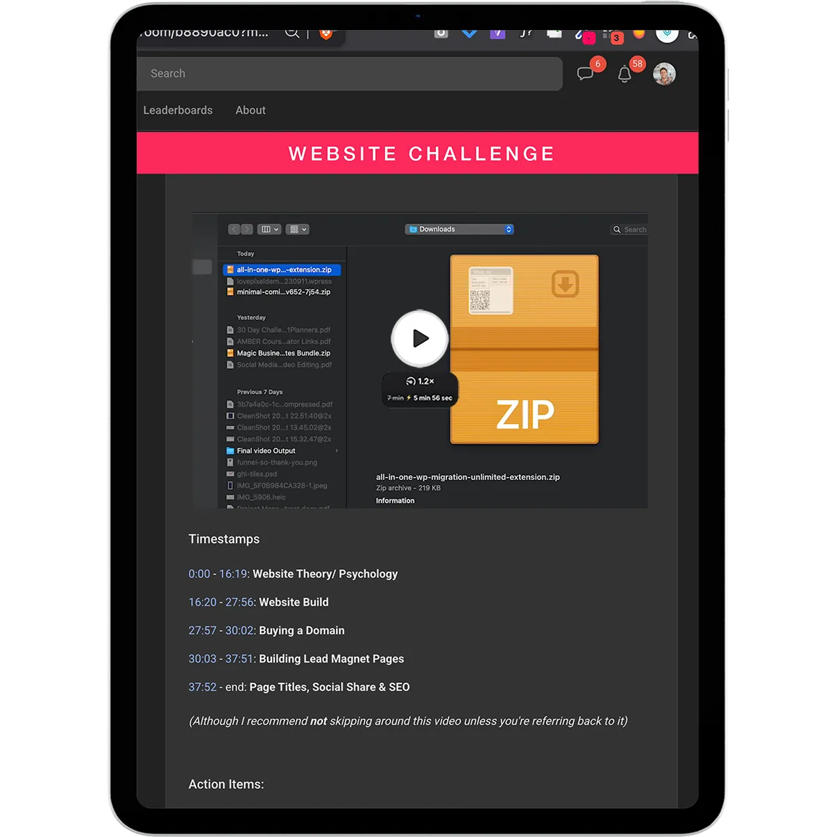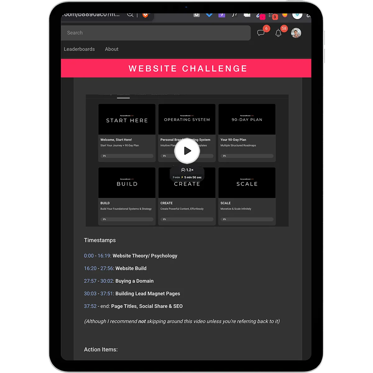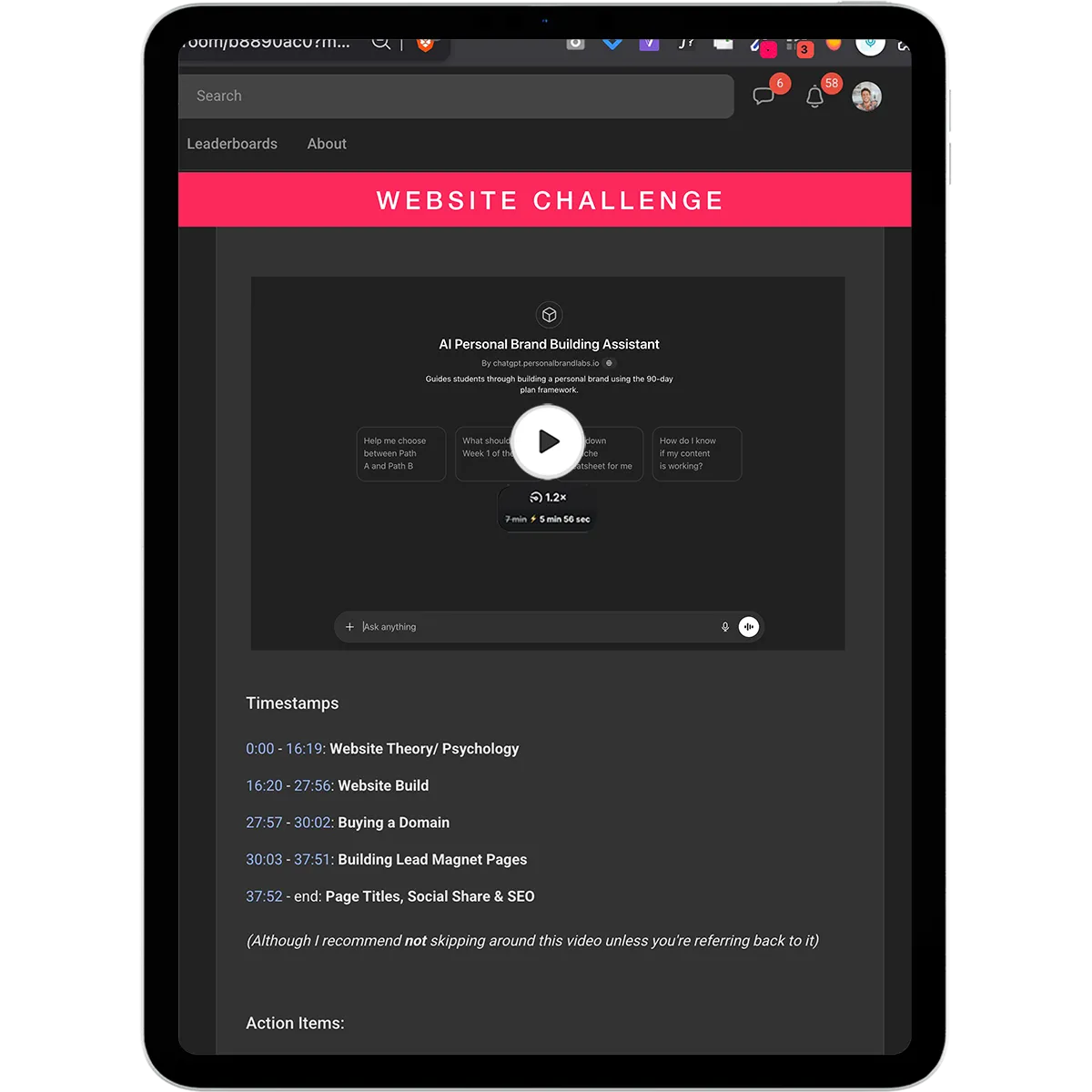 The AI Website Challenge is a complete step-by-step system that walks you through building and launching your personal brand website in just 72 hours (Friday, Saturday, Sunday). You get the exact premium template we use for $20K builds, AI-powered copy prompts, branding toolkit, and day-by-day video training. Everything is structured so you know exactly what to do each day to go from zero to LIVE.